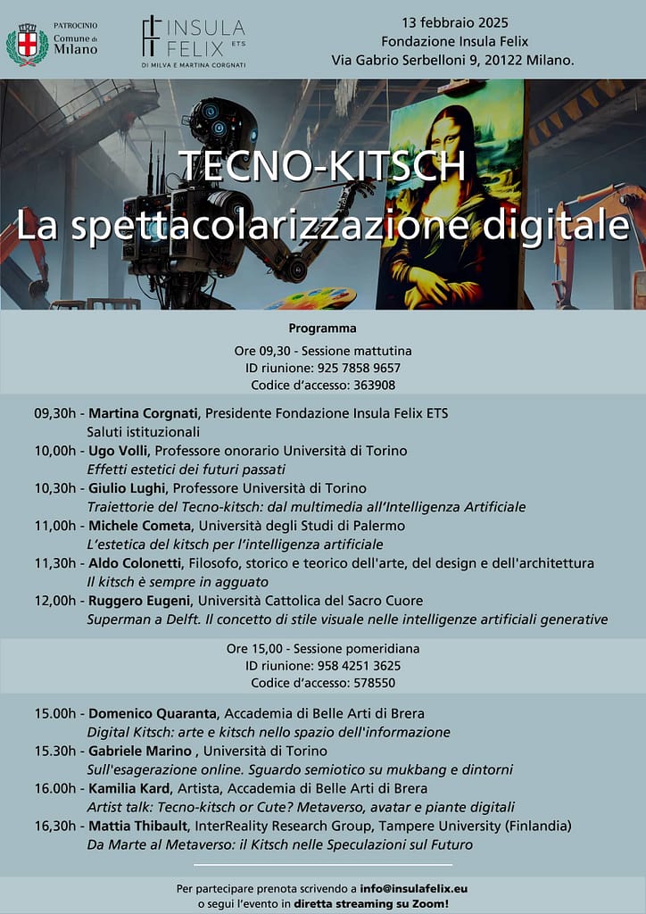 Il convegno “Tecno-kitsch. La spettacolarizzazione digitale”, organizzato e sostenuto dalla Fondazione Insula Felix ETS, e patrocinato dal Comune di Milano, si è svolto nella giornata di giovedì 13 febbraio 2025 presso la sede della Fondazione.